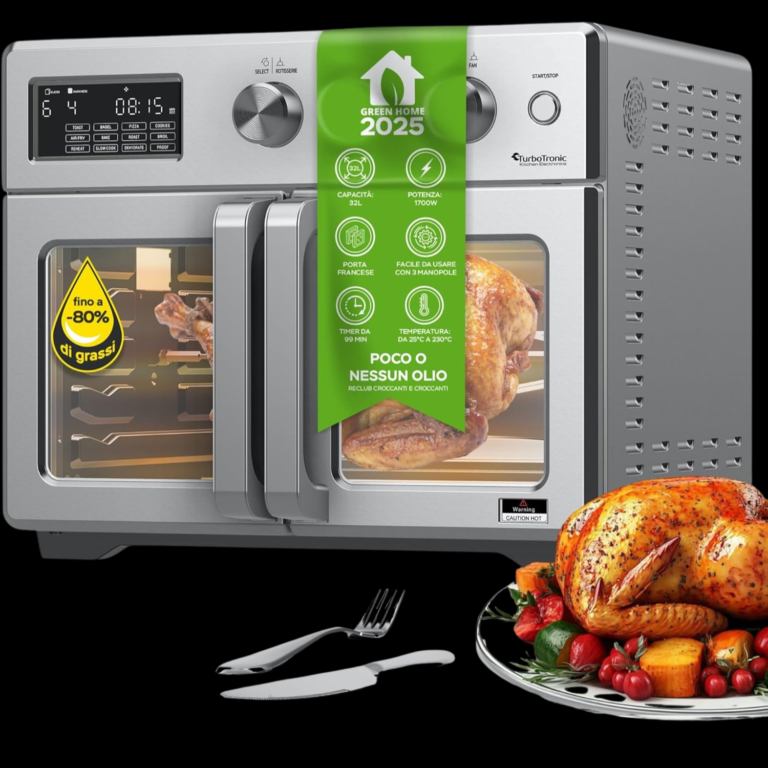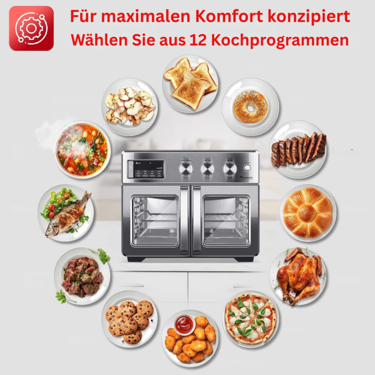 Der Ofen misst 45 x 42 x 37 cm und ist damit kompakt genug, um auf Ihre Küchenarbeitsplatte zu passen, aber dennoch geräumig genug, um große Mahlzeiten zuzubereiten. Er bietet die perfekte Balance zwischen Platz und Kapazität.