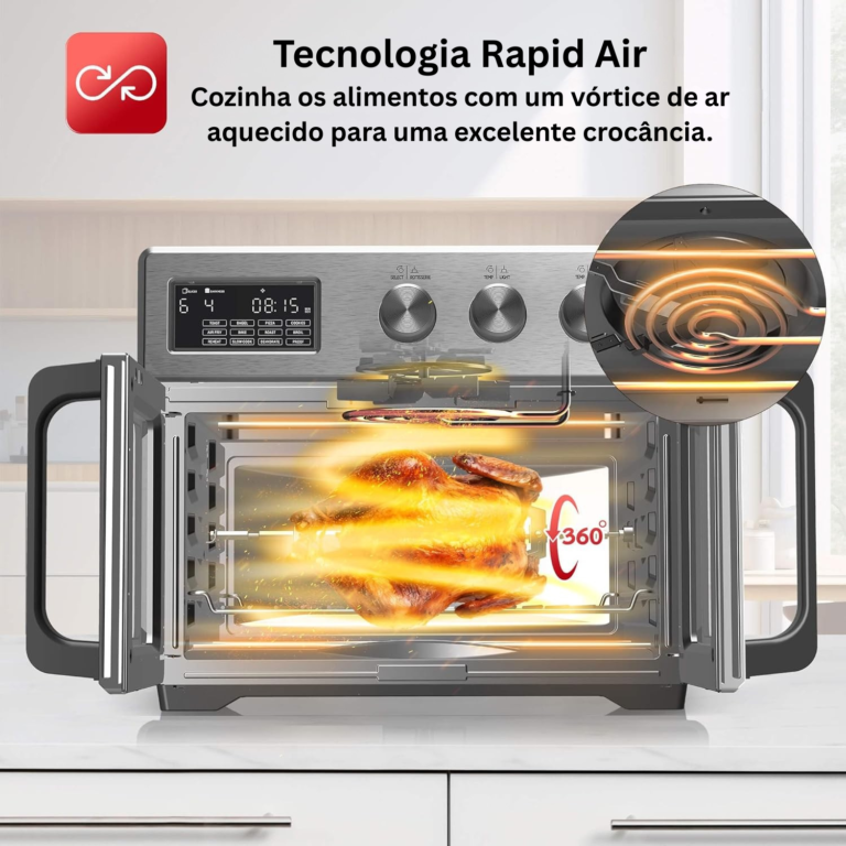 A embalagem inclui uma assadeira, grelha, espeto giratório completo (com haste e pegas), cesto para fritadeira sem óleo, tabuleiro de recolha de migalhas/gordura e manual do utilizador. Assim, terá tudo o que precisa para começar a cozinhar imediatamente.