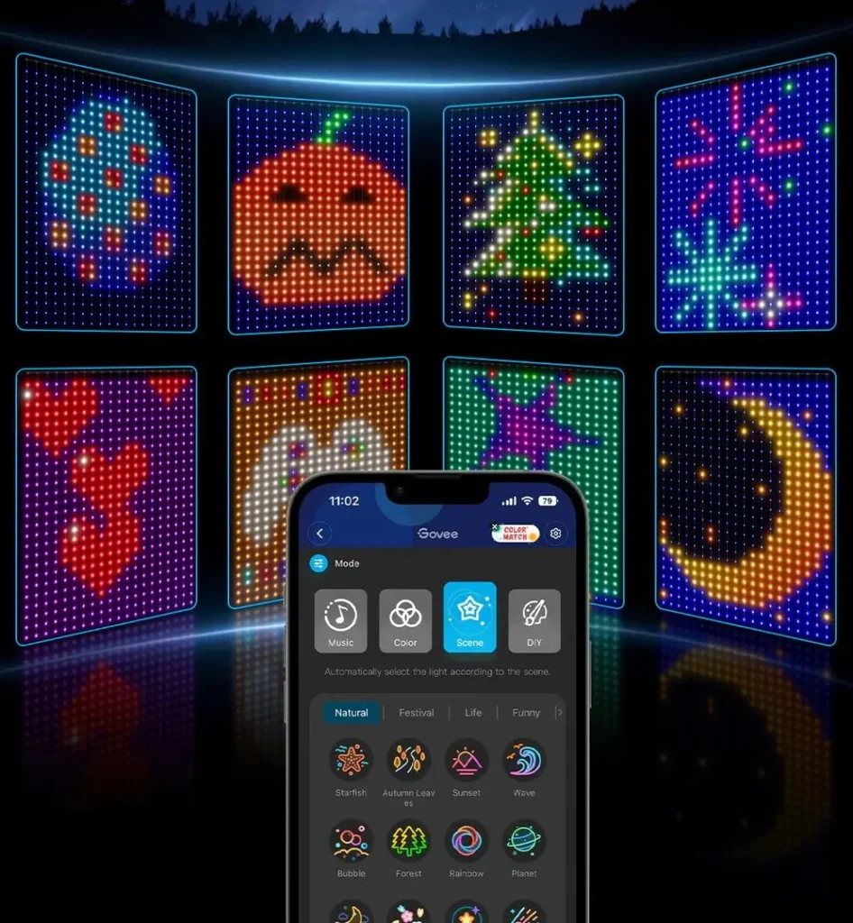 Personaliza patrones y textos directamente desde la app y elige los efectos ideales para cada ocasión: desde una velada romántica hasta una fiesta de cumpleaños, desde las decoraciones navideñas hasta hacer tu salón más acogedor. El mando a distancia con temporizador te permite programar el encendido de las luces y controlar cada bombilla individualmente, creando animaciones únicas. Gracias a la protección IP65, es ideal tanto para interiores como para exteriores: perfecta para hogares (en ventanas, balcones o terrazas), jardines, terrazas y escaparates.