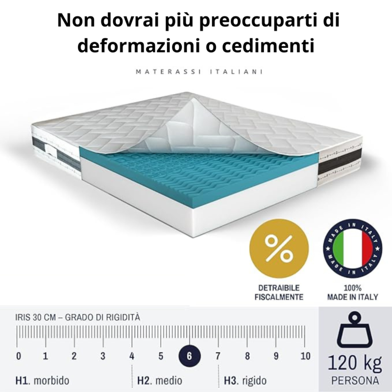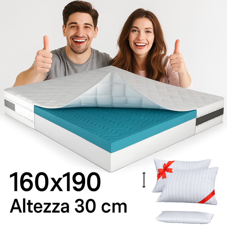 (SUPPORTO PERSONALIZZATO) – Sperimenta il massimo comfort con il nostro Materasso Matrimoniale 160×190 cm in memory modello Iris in memory foam! Grazie alla lastra di 2 cm, si adatta perfettamente al tuo corpo in risposta al calore e alla pressione, garantendo un sostegno impeccabile per notti senza paragoni