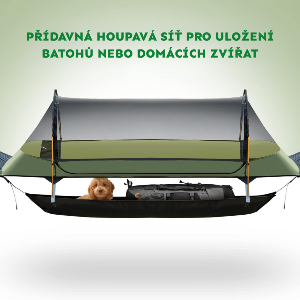 Pod hlavní houpací sítí je další úložný prostor – na batoh, fotografické vybavení nebo i malého domácího mazlíčka. Praktické řešení pro cestovatele a milovníky outdoorových aktivit.