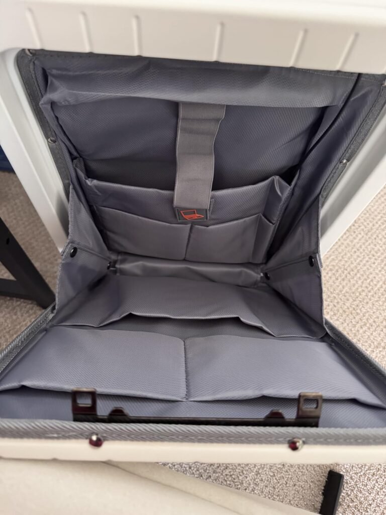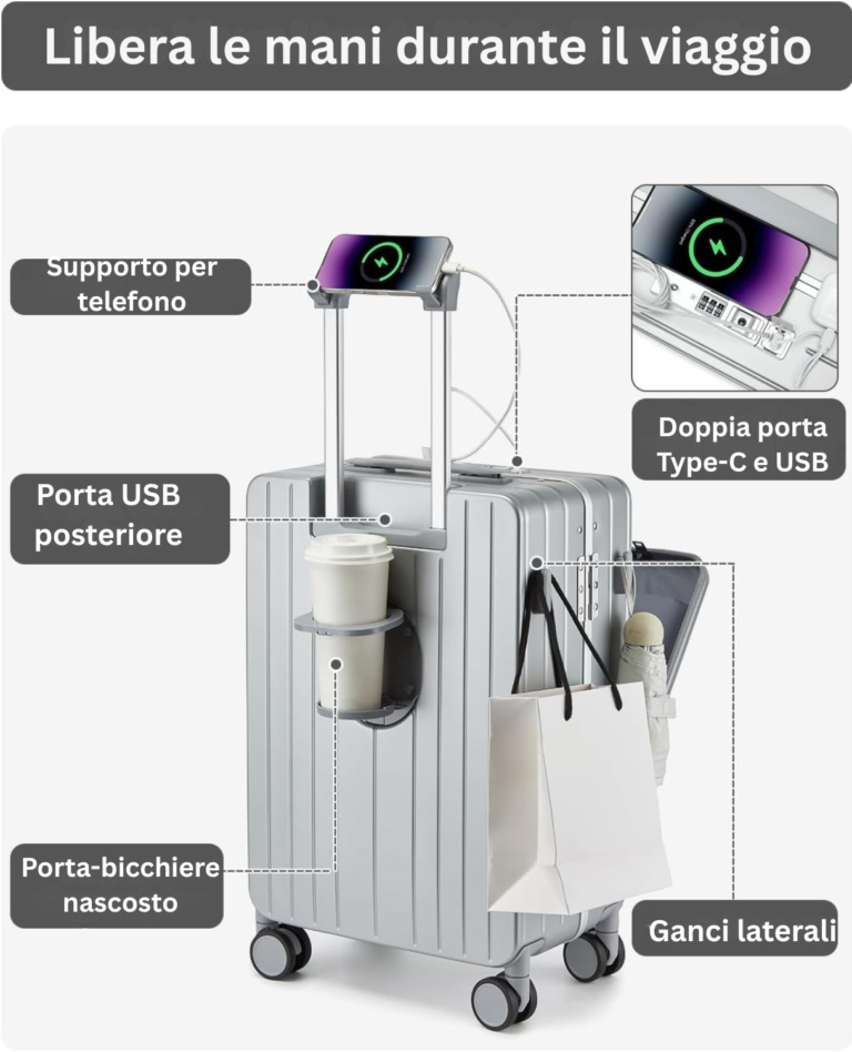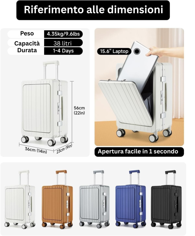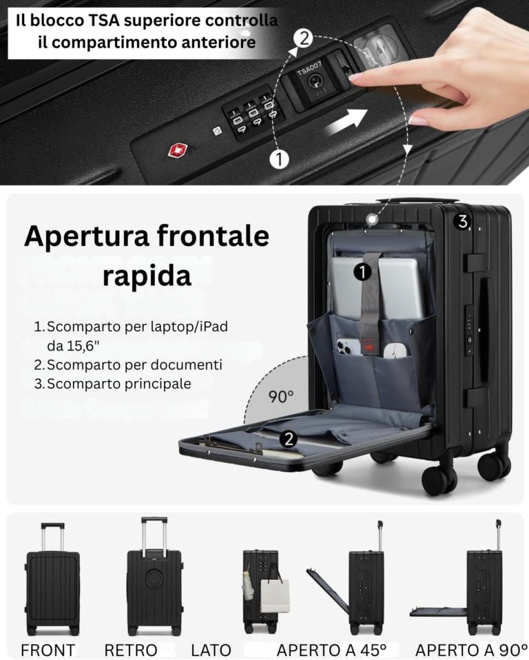 Dotato di due serrature TSA indipendenti, il trolley protegge in modo sicuro ogni zona: la serratura superiore custodisce il comparto rapido per laptop da 15,6”, mentre quella laterale difende l’interno principale. Viaggia senza pensieri: controlli doganali facili e nessun rischio di danneggiamento.
